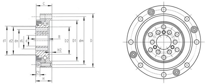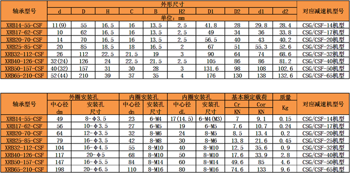 XRB型,外圈被分為兩片,內圈為整體結構,安裝時不需要法蘭和軸承座,適合CSG(CSF)系列的各類減速機。