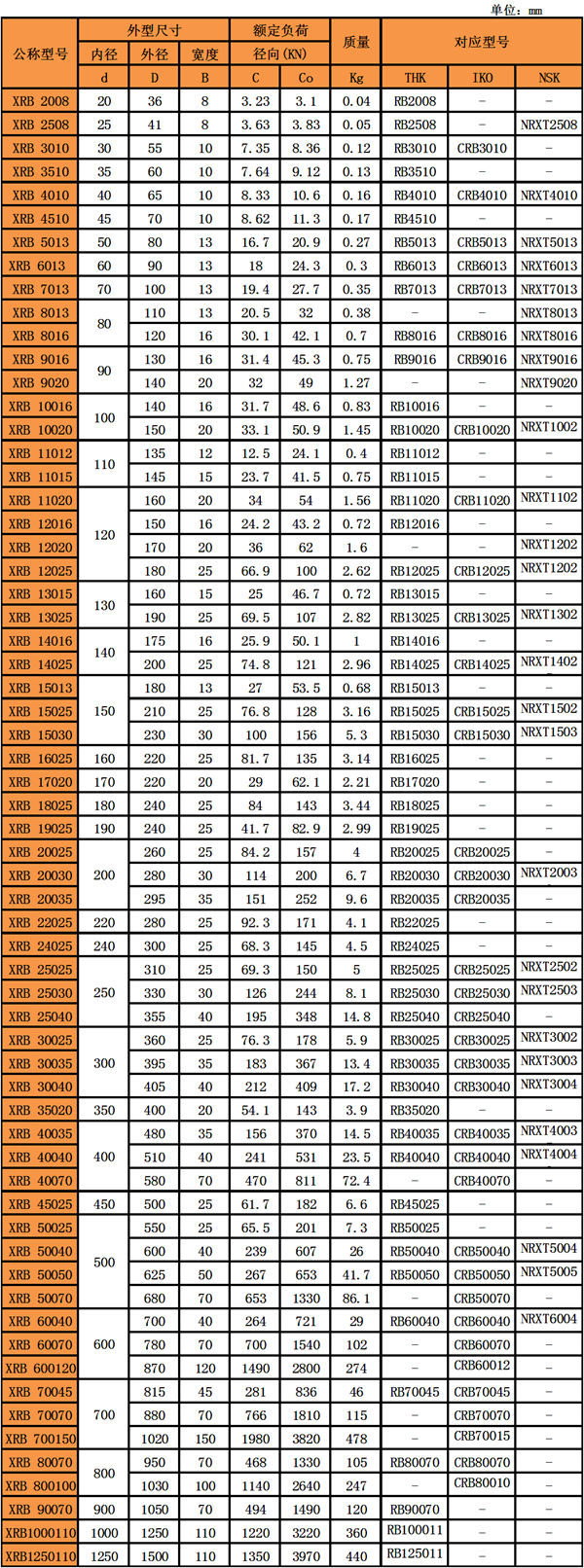 1、附帶密封圈的公稱型號(hào)是XRB***UU。